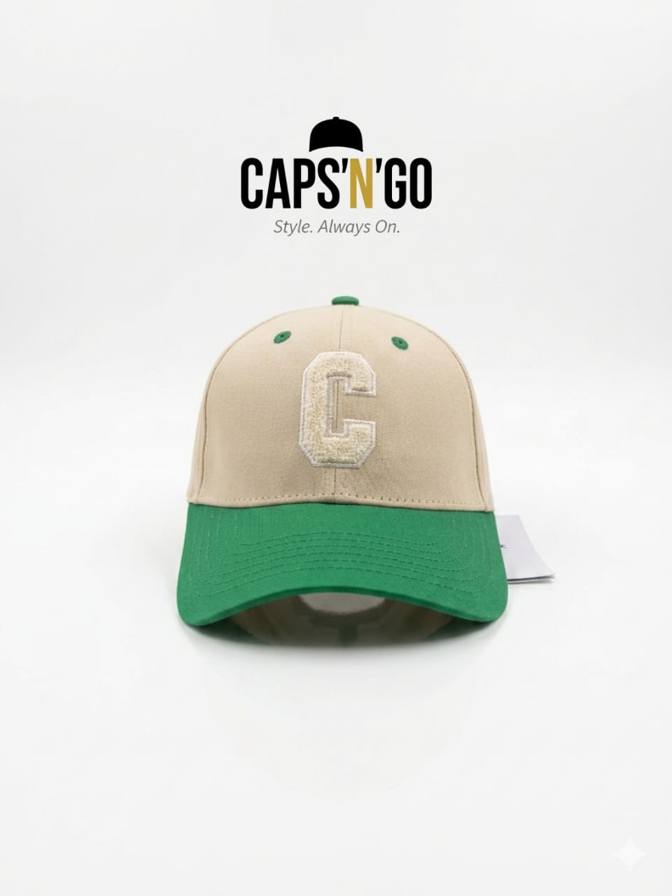 La Varsity Letter C Cap est une casquette bicolore au charme preppy et universitaire. Son corps beige sable structuré contraste parfaitement avec sa visière vert émeraude, tandis que le grand "C" en broderie chenille en façade lui confère un style vintage college authentique et tendance.